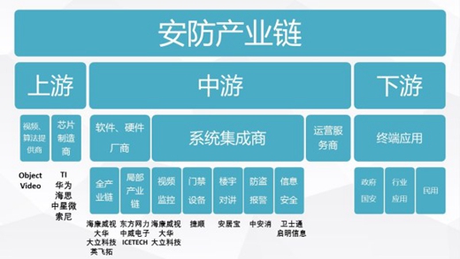 我國真正意義上的安防產業興起于20世紀80年代,歷經30逾年的積淀,已形成較為完整的產業鏈。即“上游零部件供應商—中游軟硬件供應商、系統集成商、運營服務商和經銷商—下游的終端用戶。