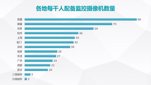 對比國外,提升空間巨大。縱覽全球,英、美是攝像頭覆蓋密度最大的國家。依據權威數據,英國每千人約配備75臺監控攝像機,美國平均每千人約有96臺監控攝像頭,而相比之下,我國攝像頭密度位居前列的北京與上海每千人配備的攝像頭數目均不到40,顯示出巨大的市場提升空間。