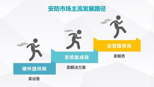 因此要加快運營服務市場發展步伐。安防運營服務是安防產業的重中之重,是全球安防產業未來發展的趨勢。在技術升級、產品同質化和成本的降低的背景下,產品市場的利潤空間逐漸被壓縮,從硬件提供商(賣設備)——系統集成商(賣解決方案)——運營服務商(賣服務)已成為主流發展路徑。