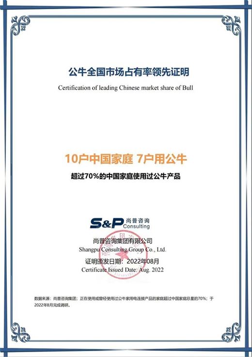 (公牛品牌獲得“10戶中國家庭,7戶用公牛”認證)