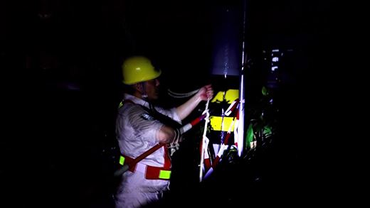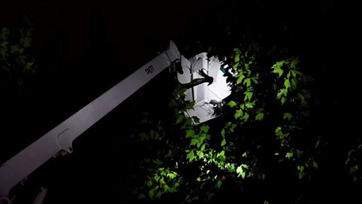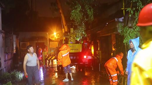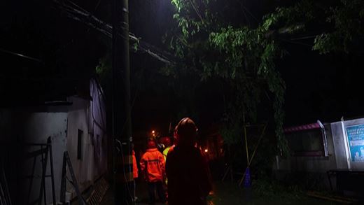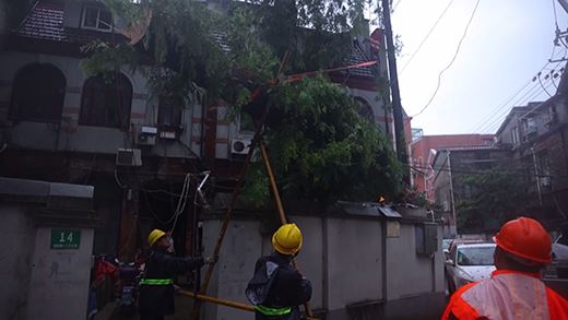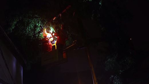 在暴雨中,搶險人員在市民的指點下,很快找到故障點,原來是大樹枝丫在狂風中碰觸到了徽寧路8a桿上的桿刀避雷器,引發了出火和開關跳閘。在評估了現場環境和搶修條件,因為風雨無法進行帶電作業,因此通過調整配網運行方式,并用絕緣斗臂車升上高空修剪周邊樹枝,確保不再發生異物碰觸。在確認電力設備正常運行后,于23點30分左右恢復送電。