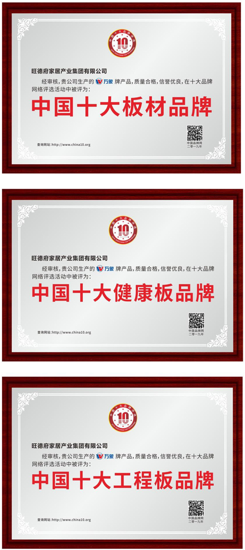 權威媒體《中國品牌網》一直對家居建材行業的發展尤為關注,特意聯合十余家主流媒體共同舉辦了“中國十大品牌”評選活動,邀請行業專家和全國消費者參與審核和投票,在板材圈引起了強烈反響。旺德府家居產業集團旗下主營品牌“萬象”,亦憑借雄厚的資質順利獲得參選資格。其在一路的選拔賽中名列前茅,最終斬獲了“中國十大板材品牌”、“中國十大健康板品牌”、“中國十大工程板材品牌”三項榮譽稱號,在多位贏家之中顯得更加閃耀。