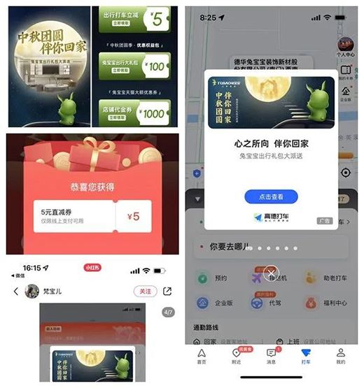 中秋佳節極具團圓之意,而家作為團圓與情感的載體,此次兔寶寶聯合高德地圖,助力“回家團圓”出行福利派送,同樣以“家文化”為載體,通過優惠券派發的方式,讓眾多中秋“在路人”充分感受到節日的溫暖與兔寶寶“讓家更好”的理念。