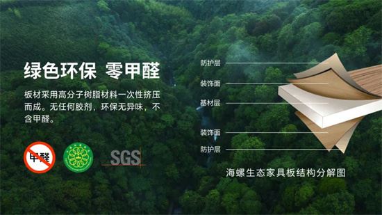 海螺生態家具板所有板材及輔材全部以高分子樹脂為主原料,經高溫高壓一次性擠出成型,無任何膠粘劑,環保無異味,不含甲醛。