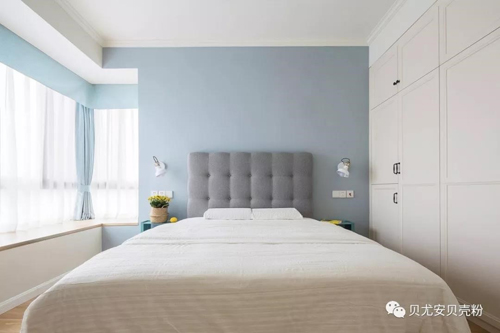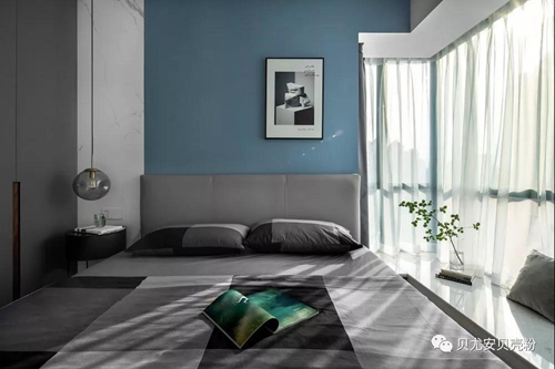 次臥床頭背景墻上海藍加閃藍調色搭配可以安撫身心疲憊,搭配淺藍色和中性灰色床品,色彩兼容,整體清新自然。