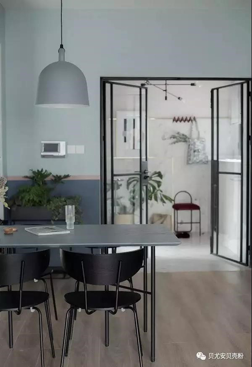 餐廳的墻面上平涂青出于藍色、閃藍色,旁邊放一些綠色的植物顯得和諧又溫暖,再搭配簡約的吊燈,顯得不累贅而又時尚。