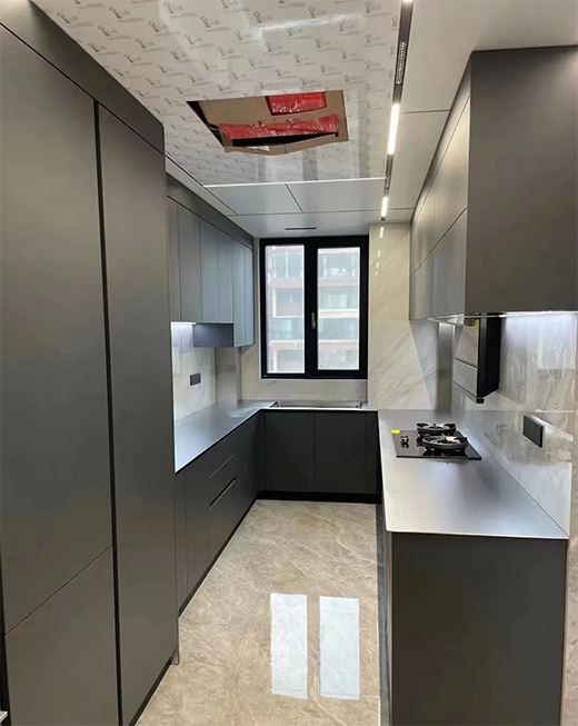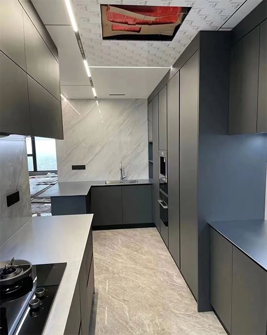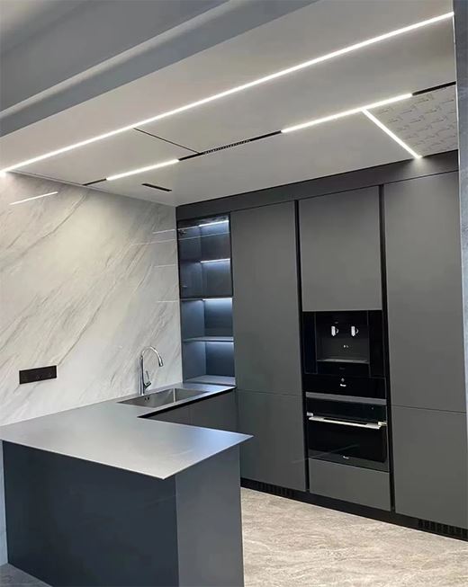 卡利亞通過自主研發的熱固微晶工藝可將柜門飾面定制成當下流行色系,除了單色以外,雙拼或者木紋色均可,溫潤細膩,還原真實木材的質感和紋理,賦予不銹鋼定制家居空間更多的可能性,而且打理起來也非常便捷。