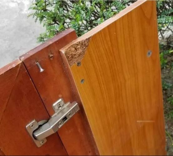 打開櫥柜門后,金玉其外敗絮其中的品質馬上暴露出來了!這就是客戶毫不猶疑換廚柜的終極原因。