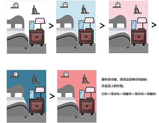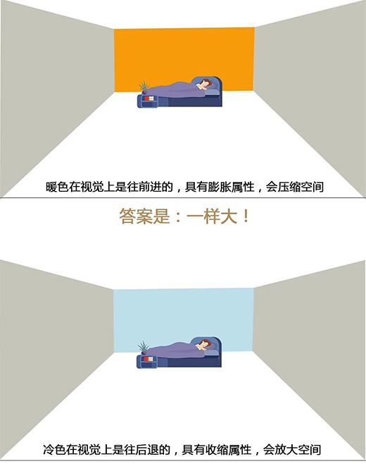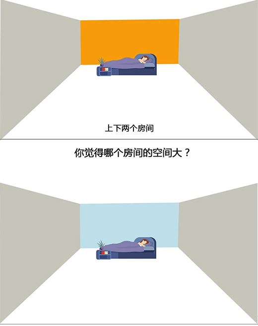 上面兩個臥室,你們第一眼會認為哪個更大?上方明亮的橙色是膨脹色,看起來面積更大,也會有“更靠近”的感覺,而下方的藍色則相比之下更小,顯得更遠,從而在視覺上放大了空間。