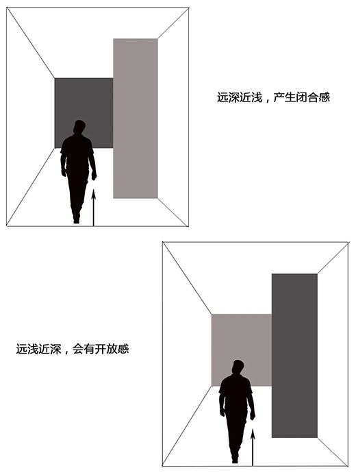 把深灰色和淺灰色放到同一個空間里,按遠近距離進行組合,可以看出,遠深近淺,會產生空間閉合感;遠淺近深,會有較開闊的感覺。同樣的道理,也可以應用在臥室。
