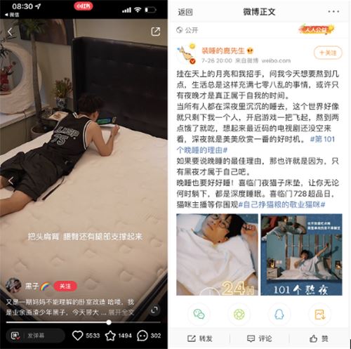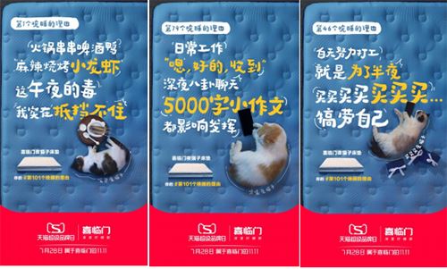 相比于說教式的傳播,喜臨門通過創意貓咪TVC《致所有夜貓子們》引發年輕人群的代入感,將不同晚睡人群比喻為各種類型的“夜貓子”,從而拉近與年輕人的距離,成功建立“晚睡更要睡得深”的心智。