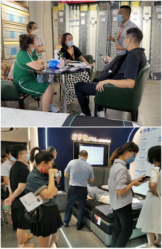 客商們零距離接觸席夢雅的匠心軟體家具產品,親自觸摸床墊柔軟透氣的面料,親自體驗席夢雅“588+測試睡眠系統”,屏幕上顯示人體的心跳頻率、呼吸頻率、體動頻率等參數,席夢雅向現場的客商證明了什么是“360°睡眠定制”。