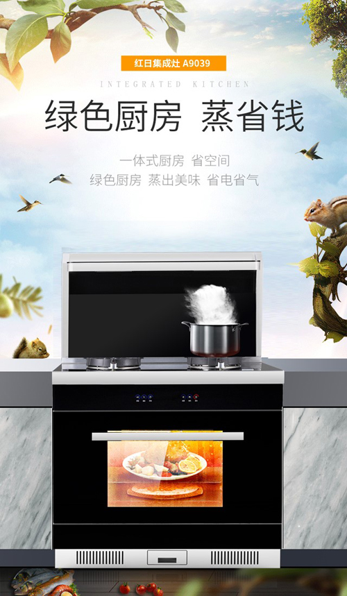 紅日紅外線一體式集成灶A9039,將采用了紅日自主研發的紅外光波技術、熱效率高達68%的紅外線燃氣灶、吸凈率可達99.96%的大吸力煙機和全方位熱能包裹的8種烹飪模式蒸箱,創新地有機結合為一體,給用戶帶來便捷、健康、安全的烹飪體驗。同時,其具有煙灶聯動、煙蒸聯動、防回火保護、定時防干燒、漏電保護等多項安全設計,告別廚房危險,真正做到讓消費者用得放心。