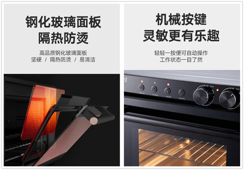 上室烤箱配置不銹鋼內膽,在耐高溫、抗腐蝕、性能穩定、不易生銹之余,更方便消費者日常清洗,有效保證內部的潔凈度;采用高品質的鋼化玻璃面板,具有硬度高、耐熱性好等優勢,對防止熱炸裂有明顯的效果;配備靈敏的機械按鍵,輕輕一按便可實現自動操作,智能生活輕松享;裝有堅固的易拉把手,輕松一拉,便能實現烤箱門的自由開合。