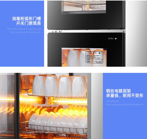 下室消毒柜特別設計弧形門槽,讓開關門更趨簡便;配置可自行調節消毒時長及消毒溫度的功能,充分彰顯人性化;最高溫度可達120℃,讓大腸桿菌、金黃色葡萄球菌等細菌無處可逃。
