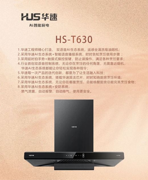 別擔(dān)心,“中國十大健康節(jié)能廚衛(wèi)電器品牌”——華速廚衛(wèi),幫你徹底解決廚房油煙問題。和其他油煙機不同的是,華速雙語音AI生態(tài)系統(tǒng),遙感全清洗吸油煙機——HS-T630將煙機吸風(fēng)口下潛至距灶臺350MM黃金控?zé)焻^(qū),同時在頂部機身增加了輔助進風(fēng)口,并通過雙風(fēng)口環(huán)吸技術(shù),把油煙直接從油煙產(chǎn)生處吸走,達到靠得越近吸得越凈的效果,真正實現(xiàn)油煙不上臉,讓烹飪者徹底遠(yuǎn)離油煙困擾。此外,其還具有以下5大特點: