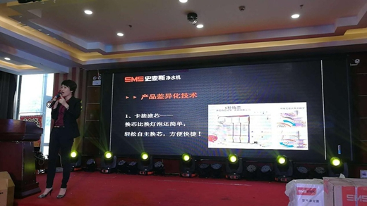 另外,凈水事業部作為史麥斯近年來大力發展的廚衛市場細分項目之一,其發展迅猛,在市場上已具備了趕超眾多知名品牌的口碑。而在本次會議中,為使臨沂經銷商們更好地了解到史麥斯凈水產品如何實現“彎道超車”,史麥斯凈水事業部營銷總監唐心榆登臺為家人們做一一的展示。智能化產品、多功能切入,史麥斯凈水產品以絕對的科技優勢走在了行業的前端,此外,史麥斯產品向來以品優質穩的優點著稱,相信在科技含量與產品品質的相輔相成之下,史麥斯定能在2018年中實現品牌跨越式發展。