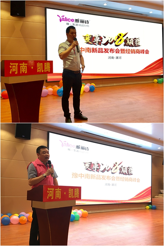 首先是廣東雅麗詩電器股份有限公司豫中南運營中心凱騰商貿(mào)總經(jīng)理楊勝舉先生發(fā)表講話。在簡單介紹了到場嘉賓之后,楊總回顧了在過去一年中豫中南精英團隊們在各終端奮戰(zhàn)的成績。從一同積極開展各種終端推廣活動到一同享受工作之余的放松旅游時刻,雅麗詩團隊一直在路上共享著酸甜苦辣,也因此造就了強大的團隊凝聚力。
