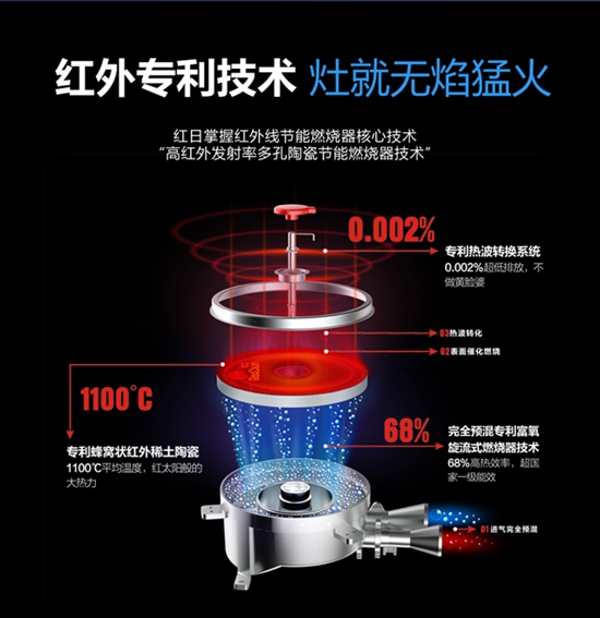 此外,紅日廚衛紅外線集成灶采用紅外發熱技術,熱效率可高達68%,遠超傳統燃氣灶國家標準,有毒氣體排放幾乎為零,在火力更猛的同時,還在最大程度上節約了能源,三大高效節能核心專利技術,造就無焰猛火。