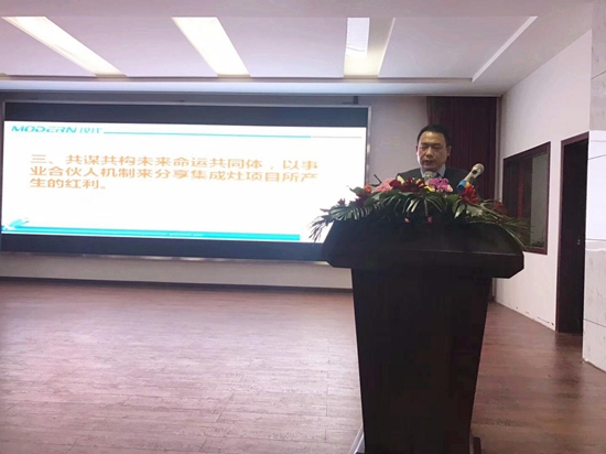 大會開始,中山市現代廚房設備有限公司董事長萬澤斌先生致歡迎辭,圍繞“以十年互信機制 共筑未來共同體”的研討目的,以“十年品牌路 百年品牌心”為主題發表講話,并對各方支持現代廚衛事業發展的經銷商和媒體朋友表達了感謝。