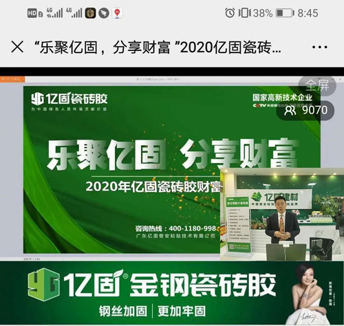 2020年3月28日19:30—21:00,億固瓷磚膠成功舉行了以主題為“樂(lè)聚億固,分享財(cái)富”的線上直播財(cái)富分享會(huì)。好品牌、好項(xiàng)目、好政策,短短90分鐘成功吸引了全國(guó)9000多名建材精英們參與,32名客戶達(dá)成合作意向。