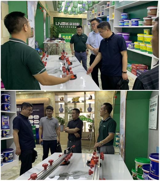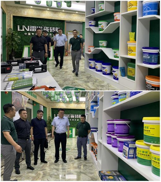在企業高層領導的引導下,馮董和李局首先參觀了雷諾產品展示廳,雷諾企業歷程、規模實力以及各類雷諾臻品依次映入眼簾,雄厚的品牌底蘊和至臻至美的產品無一不展現著雷諾的企業實力和匠心精神。其中,鄧總向來賓們特別介紹2022年新品——雷諾聚能貼。新品在配方上全新升級,實現界面處理、瓷磚背膠、墻面防水三效合一,粘力更強,性能更優,耐久更安全,可質保50年。在目睹雷諾聚能貼的實際效果后,各位領導紛紛對雷諾新品給予高度的評價。