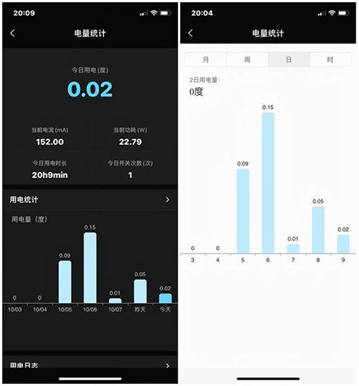 另外,向日葵P1還支持電量統計功能,我們可以在APP上實時查看電腦等設備的用電情況,如當前的電流、功耗、用電時長、開關次數,還有近期每天用電的度數,用電情況是一目了然。