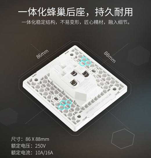 高達5000次耐拔插測試,拔插更輕松,外部采用涂層工藝,不僅耐磨還更耐用;內部采用錫磷青銅導件,確保用電更安全;一體化蜂巢后座,六邊形蜂巢設計,堅硬不易變形,匠心工藝盡顯細膩精致。