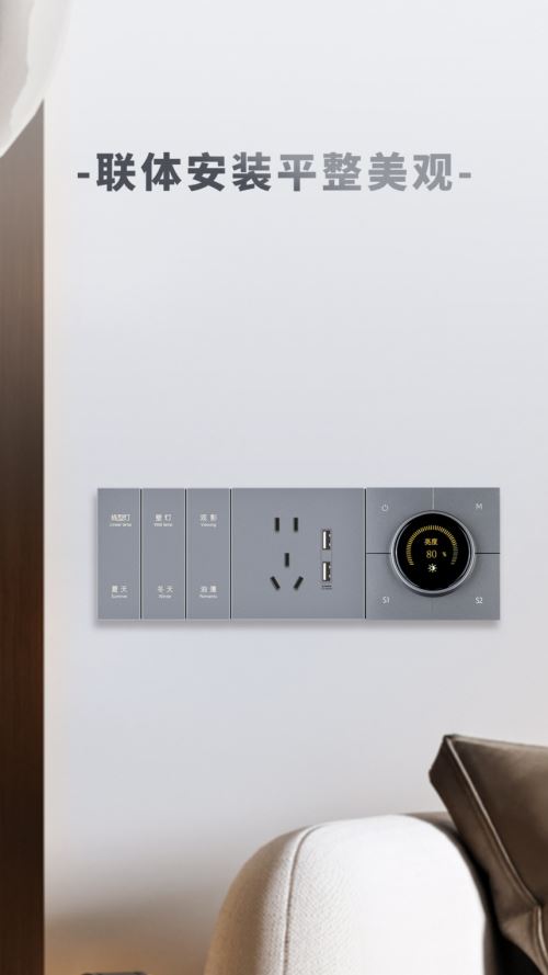 旋鈕調光開關屬于標準功能件,適于安裝在聯體開關上。相比單86型結構,聯體開關的安裝效果更平整、美觀、大氣,檔次更高。