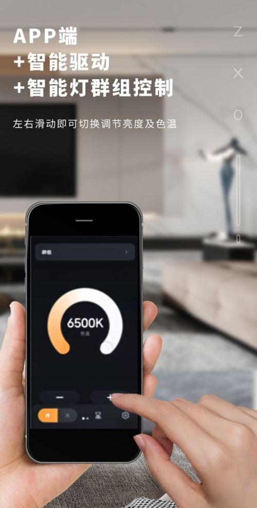 旋鈕上有數據顯示,一目了然,彰顯科技感與時尚感。用戶操作的時候,可以用手旋鈕開關,也可以在手機APP屏幕中左右滑動,即可切換調節亮度及調節色溫。