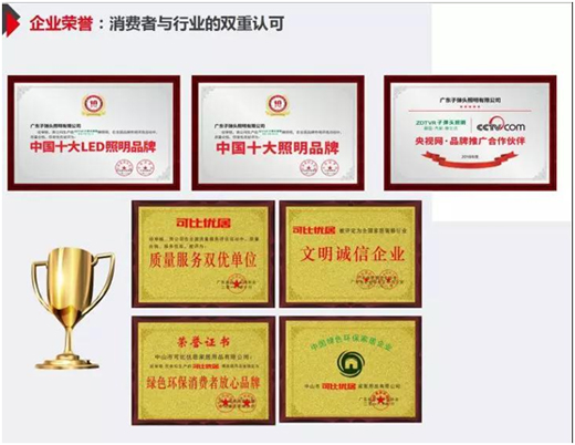 公司子彈頭照明是央視戰略合作十大LED照明品牌,是中國LED照明品牌十強,可比優居短短一年就獲得了,最具成長價值品牌、誠實守信企業、最具創新價值的家居品牌稱號;