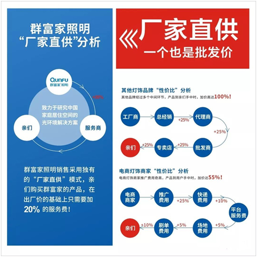 當(dāng)消費(fèi)者去市場選燈,會(huì)發(fā)現(xiàn)品牌知名度高的燈具產(chǎn)品雖好,但有些卻太貴。群富家照明,以一線品牌質(zhì)量嚴(yán)苛要求生產(chǎn),但在價(jià)格上會(huì)更親民,這是因?yàn)槿焊患役`行廠家直銷體系,以服務(wù)商合作模式,盡可能地減少了中間環(huán)節(jié),從而實(shí)現(xiàn)讓利于消費(fèi)者。還有一點(diǎn)是,基于群富家在配件方面的優(yōu)勢、集約化生產(chǎn)等,也使成本得到了很好的控制。