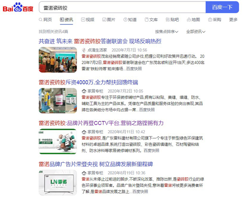 如若消費者心中還有些許猶豫,還想了解品牌的更多信息,那不妨通過百度資訊瀏覽相關文章,精準了解該品牌的實時資訊及行業高度。如雷諾最近新推了什么樣的瓷磚膠、將舉辦什么樣的全國性優惠活動、何時召開新品發布會、又取得了哪些令行業震驚的成績……諸如此類的實時資訊,我們都可緊隨行業媒體的最新報道將其“一網打盡”。