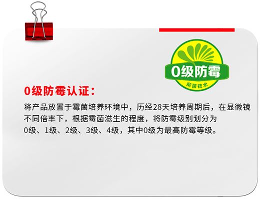 產品通過GB/T1741-2020《漆膜耐霉菌性測定法》的防霉檢測,達到0級標準,有效抵御黑曲霉、黃曲霉等九大霉菌。