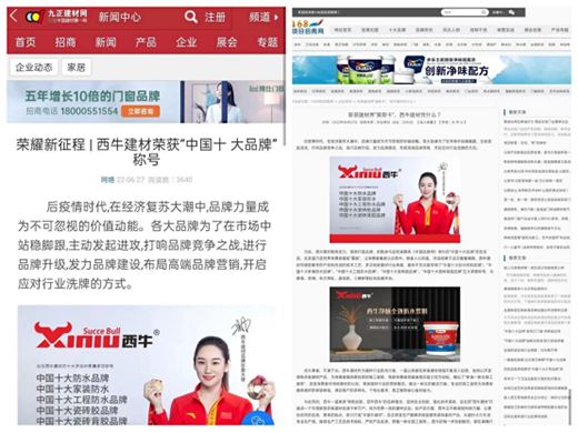 西牛建材憑借“品質為根,服務為本”的市場理念,獲得國內消費者的廣泛認可,客戶產品使用熱度持續高企,引起《新浪網家居》、《今日頭條》、《中國品牌網》、《市場與營銷》、《中國涂料品牌網》、《九正建材網》、《中國家居資訊網》、《168項目招商網》、《中華網》、《中國建材家居網》等十多家媒體的爭先報道。