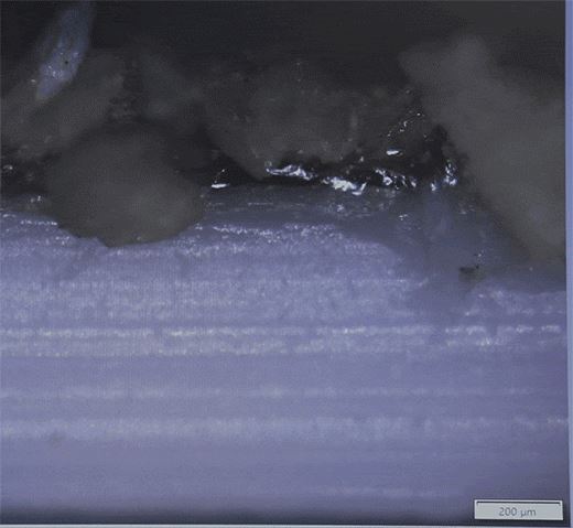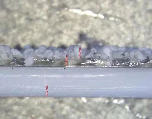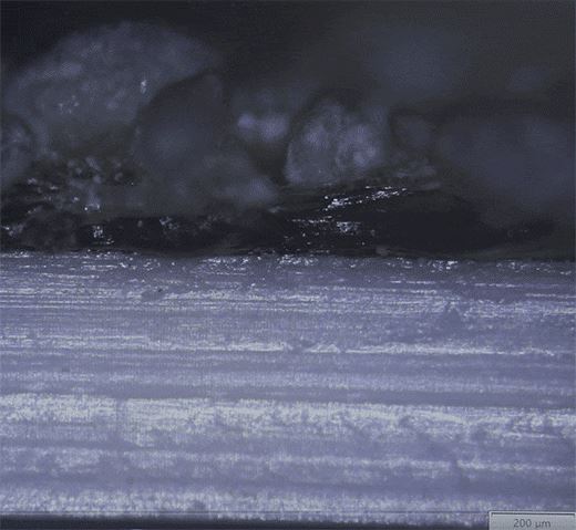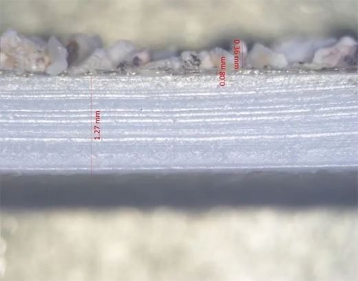 如上圖所示,顯微鏡下的此種卷材,主體片材厚度超過1.2mm,自粘膠層厚度卻遠不足0.25mm。若膠層厚度不達標且顆粒保護層砂子粒徑過大,砂子可能會穿透過薄的自粘膠層損傷主體片材,容易導致該防水卷材實際使用中風險陡增。