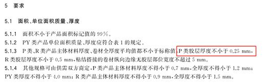 GB/T23457-2017《預鋪防水卷材》中明確規定P類膠層厚度≥0.25mm。