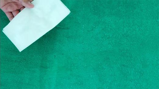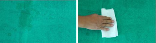 耐水不粘手、擦拭不脫色不少地面加固劑無防潮耐水的功能,干透后遇水汽會粘腳,從而影響施工人員的工作效率。為了測試這款F102綠金甲地面加固劑耐水性能,我們把清水滴在涂刷了F102綠金甲加固劑樣板上,隨后用紙巾擦拭,未見脫落、掉色或粘手現象。