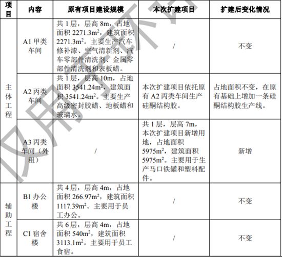 項目內容:本次擴建項目主要租賃原項目南側廣州文星實業有限公司廠區內 D 區、E 區、F 區、G 區廠房(位于廣州市增城區中新鎮恒創工業園 3 號,下文稱“A3 丙類車間 ”)作為新增產品馬口鐵罐和塑料配件生產線,新增產品硅酮結構膠生產線則依托原項目 A2 丙類車間進行生產。擴建前項目占地面積 26679.9m2,建筑面積 15909.91m2,擴建項目新增占地面積 5975m2,新增建筑面積 5975m2,主要建筑為一個 1 層生產車間,內設注塑區、制罐區和倉庫。本次擴建項目主要增加馬口鐵罐、塑料配件和硅酮結構膠生產線,新增三種產品(馬口鐵罐、塑料配件和硅酮結構膠),不改變原有項目的產品種類和產能、員工人數以及工作班制。擴建后項目總占地面積 32654.9m2,總建筑面積 21884.91m2。
