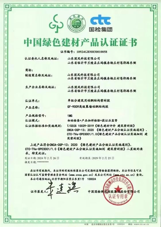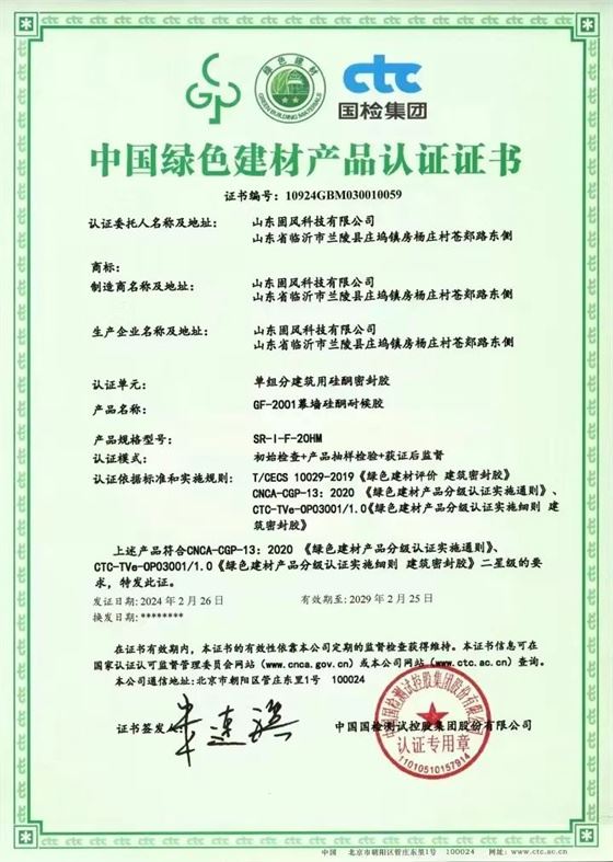 在現代建筑行業,選擇正確的材料是確保結構安全和延長建筑物使用壽命的關鍵。近日,喜訊傳來,山東固風科技有限公司的兩款旗艦產品——著名品牌硅酮膠密封膠和硅酮耐候密封膠,雙雙通過了中國綠色建材產品認證,這不僅是對固風科技實力的認可,更是對其在環保與創新承諾方面的肯定。