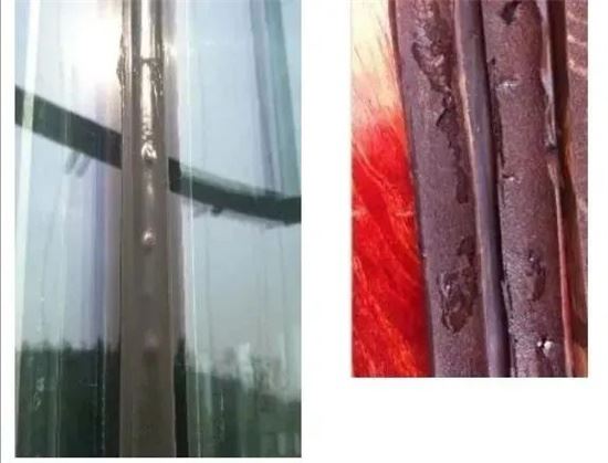 工人站在腳架上面注膠,注膠的均勻性不易掌握,膠縫里面容易裹進空氣。膠縫修整空氣壓縮后,會產生向外的隆張力,耐候膠縫一般都較寬,厚度較小,提供高位移能力的耐候膠,硬度都較低,膠未固化前很軟。壓縮空氣的隆張力把膠縫慢慢撐起泡。