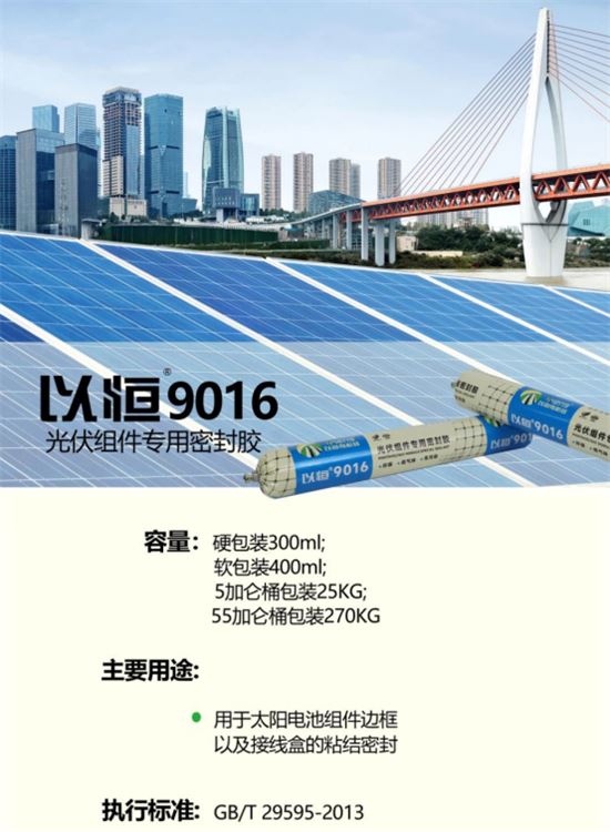 以恒9016光伏組件專用密封膠具有超強的粘附力,能夠確保與光伏組件邊框及接線盒的緊密粘結,有效防止水分和灰塵的侵入。同時,其優異的耐候性,使得密封膠能在極端的氣候條件下保持穩定的性能,為光伏組件提供長久的保護。
