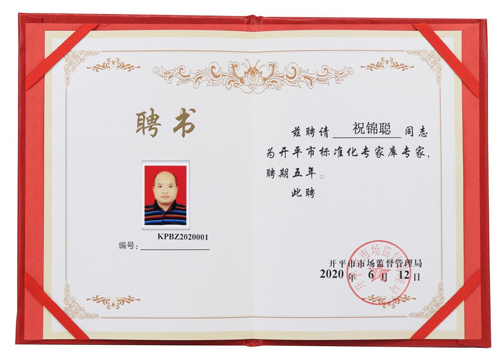 6月12日,億洋管業董事長祝錦聰先生被開平市市場監督管理局聘為開平市標準化專家庫專家,聘期為五年。