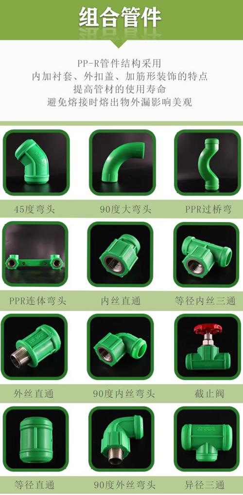 PP-R管件結構采用內加襯套、外扣蓋、加強筋形裝飾的特點,提高管材的使用壽命,避免熔接時熔出物外漏影響美觀。