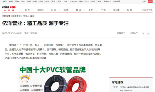 億洋管業,自從在由泛家居權威平臺《中國品牌網》主辦,《中國建材家居網》、《中國品牌招商網》等十余家行業知名網站協辦的“中國十大品牌”評選活動中,實力斬獲“中國十大PVC軟管品牌”后,便轟轟烈烈地展開系統化的品牌推廣戰略大計!