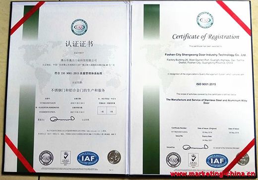 來自中國門窗六大生產基地之一——珠三角生產基地的佛山市晟王門業科技有限公司是一家專注研發生產不銹鋼門和鋁合金門窗的大型實力門窗企業,在歷年的沉淀中形成了一套符合自身發展的系統體系。如今,晟王門窗經過不懈的努力,憑借著出色的生產實力及質量管理系統,順利通過了“優克斯認證(杭州)有限公司ISO9001:2015質量管理體系標準”的審核和認證,并榮獲由“優克斯認證(杭州)有限公司”頒發的“ISO9001:2015質量管理體系標準”的認證證書。