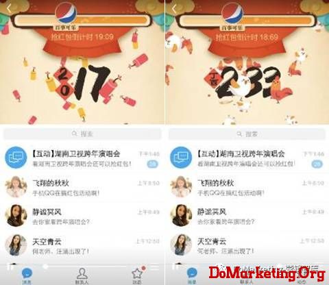 從去年品牌合作案例中,也可以看出紅包營銷之于商家春節營銷的重要性。2016年除夕夜,與QQ合作的巴黎歐萊雅在專享時段任性撒紅包,品牌QQ公眾號粉絲成功吸粉400萬人。而在與挖財的合作中,QQ專門為挖財開啟一小時專享通道發出億元紅包,除夕當天,挖財APP的訪問量達到平常20倍,登上App Store財務榜第二。