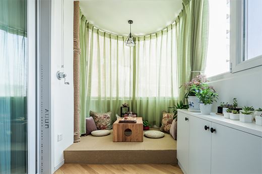 除此之外我們還可以把陽臺抬高做成地臺,在上面布置坐墊與小茶臺,在這里品茶休閑,也是非常舒適自然的。