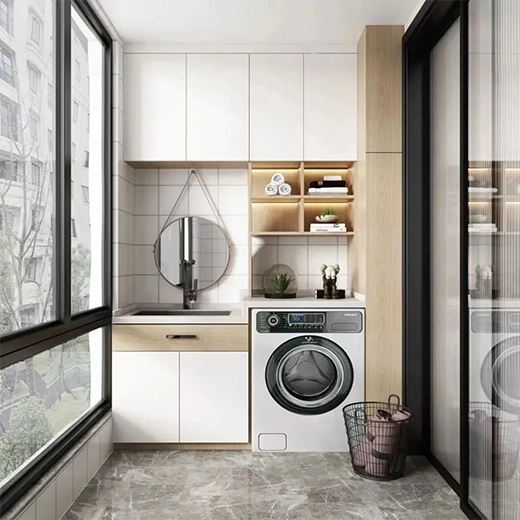 因為陽臺接近外界,有著比較好的陽光與通風,更利于衣物的晾曬,也符合大多數家庭的生活習慣,所以如果陽臺空間足夠的話,不妨把它打造為一個集盥洗和收納為一體的功能區。