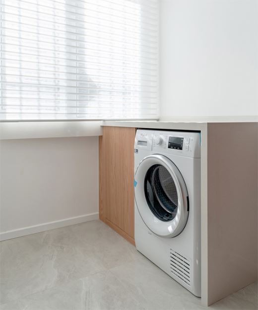 我們可以選擇在陽臺定制一個吊柜+地柜組合,地柜嵌入洗衣機,洗晾曬收納一步到位。另外也可以巧用隔板、置物架等收納工具,既美觀又省空間。